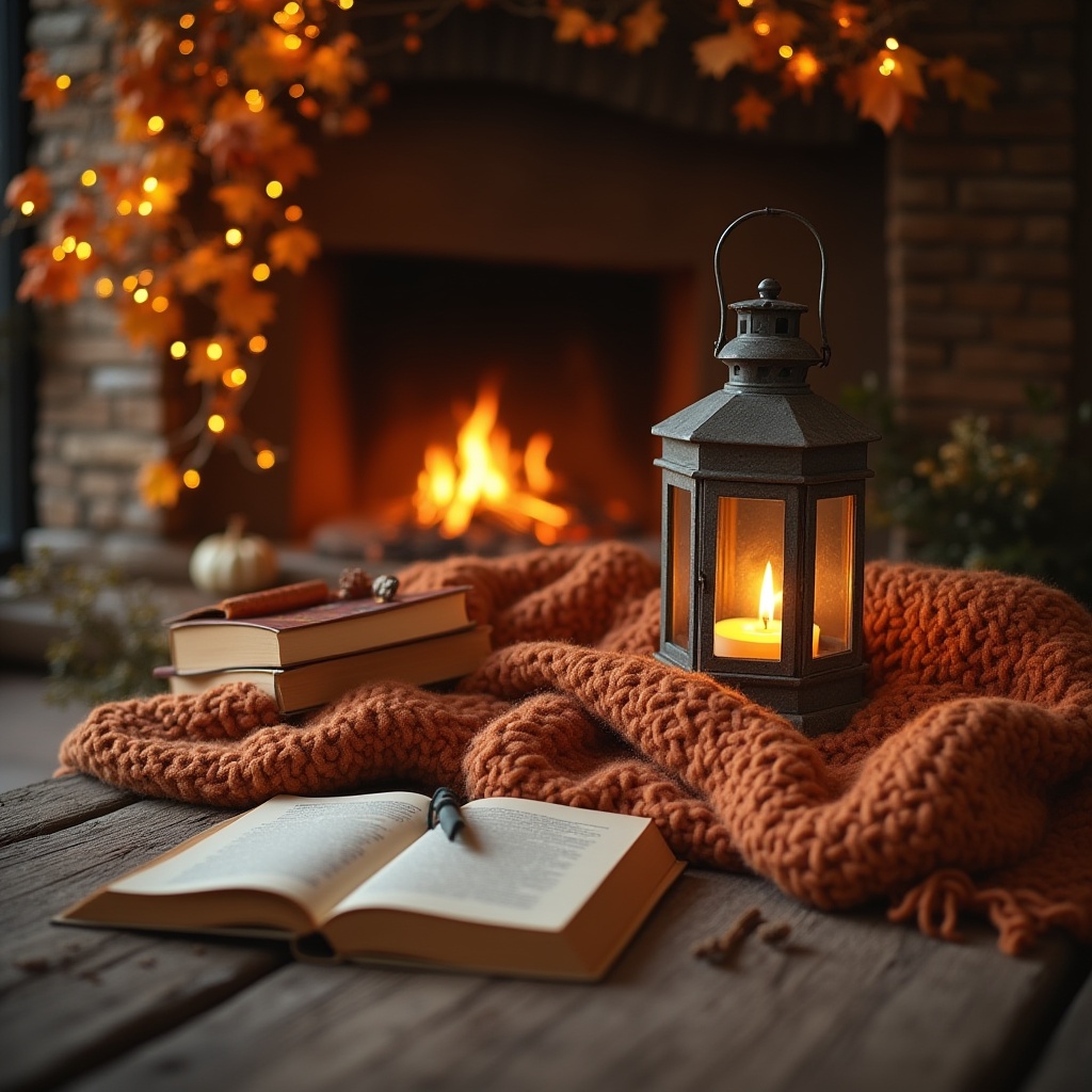 A cozy space features a lantern, warm blanket, and books by the fireplace, creating a peaceful atmosphere perfect for relaxation.