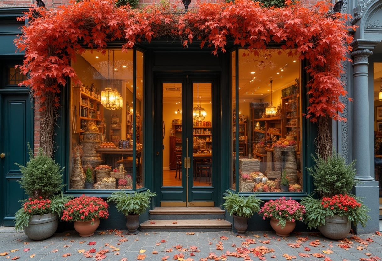 aesthetic, architecture, atmosphere, autumn, cozy, decor, entrance, festive, flowers, foliage, harvest, inviting, nature, outside, red leaves, seasonal, shop, shopping, storefront, warm light