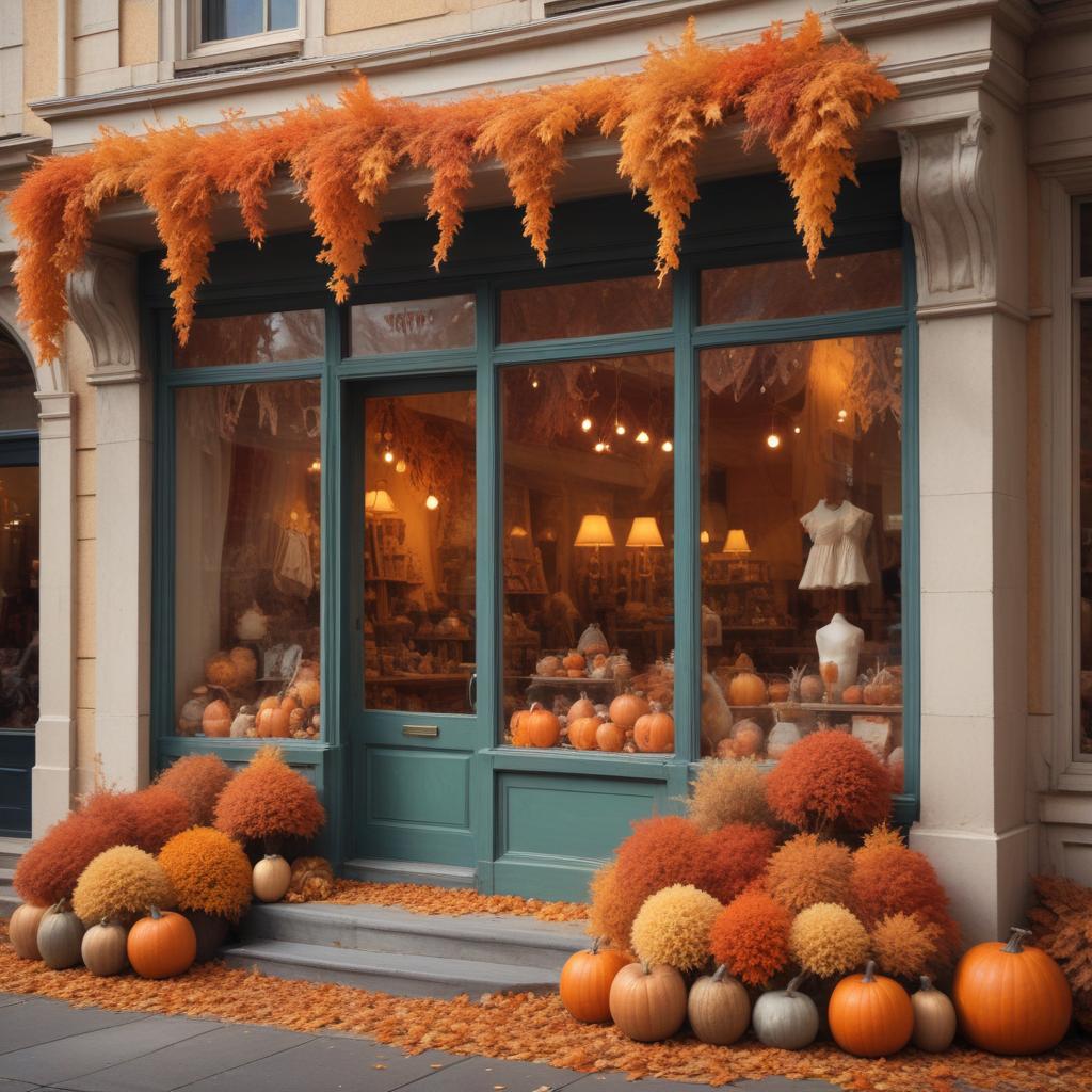 A charming boutique features a vibrant autumn display with colorful pumpkins and lush foliage, creating a warm seasonal atmosphere.