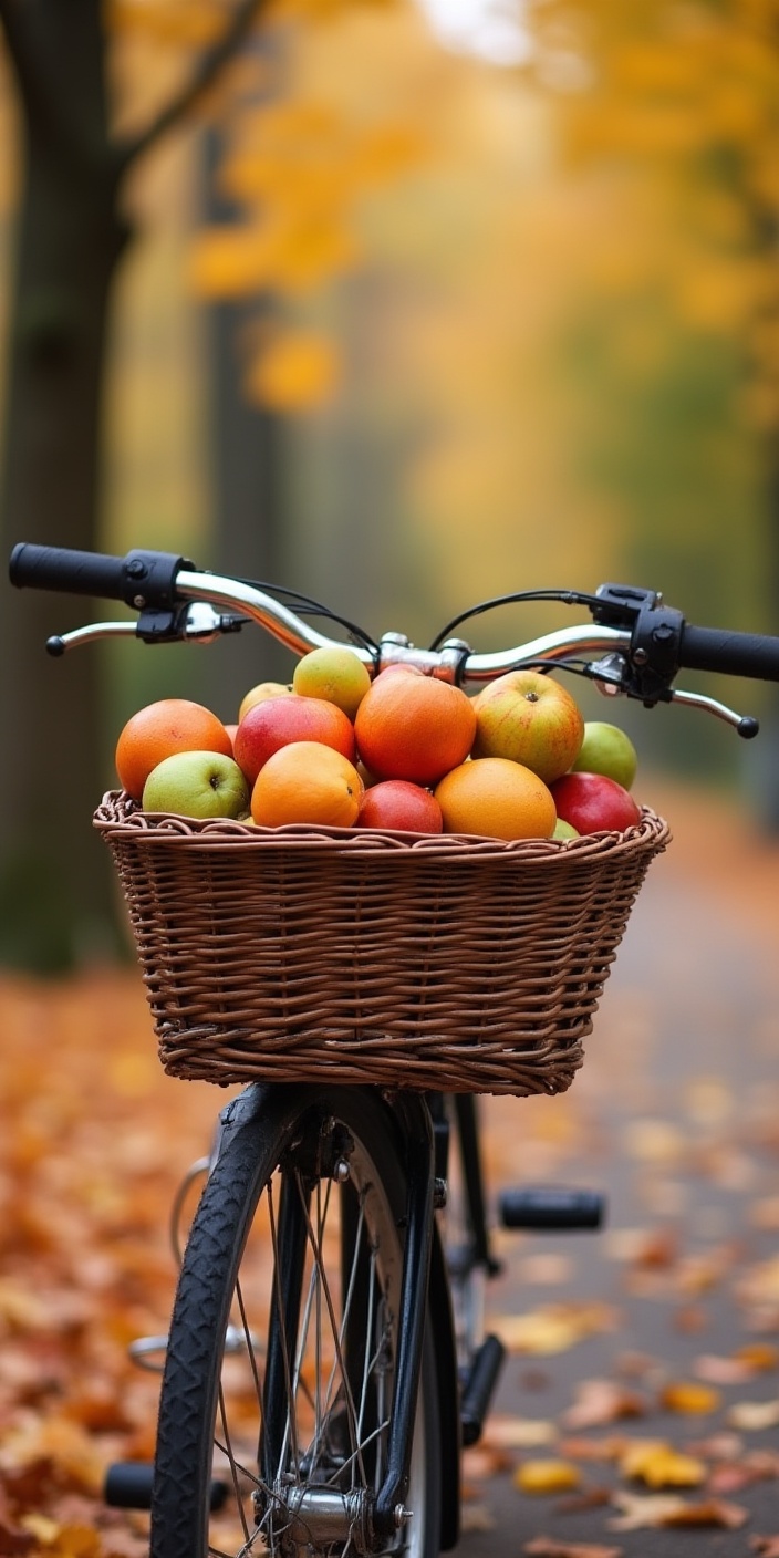 A bicycle with a wicker basket full of colorful fruit rests on a path surrounded by autumn foliage, showcasing seasonal beauty and harvest.