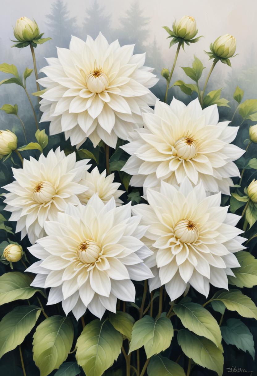 A cluster of stunning white dahlias stands tall in a lush garden. The soft light creates a peaceful atmosphere around the flowers.