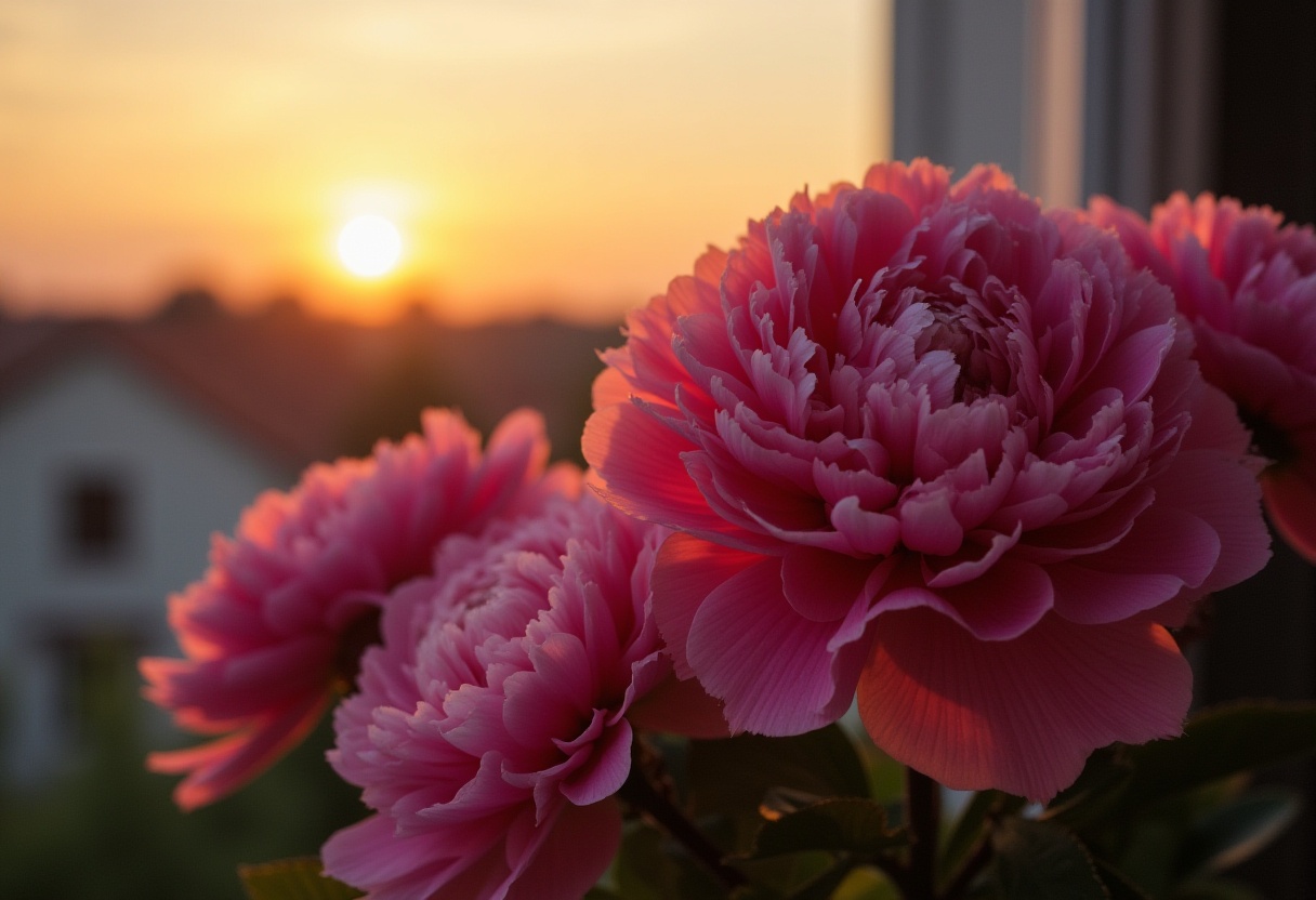 Colorful peonies are in full bloom against the backdrop of a warm sunset, creating a peaceful and vibrant atmosphere in the garden.