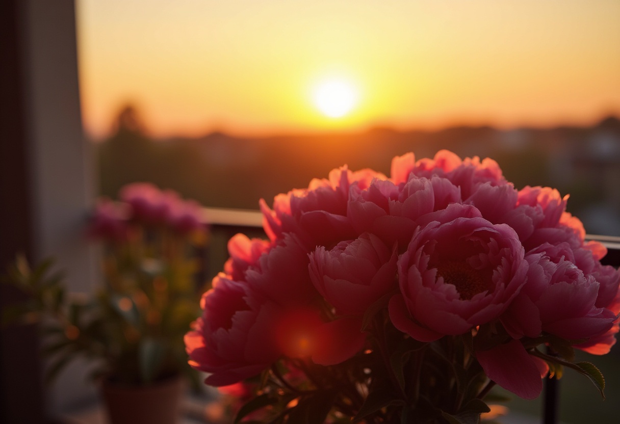 Peonies in soft pink hues blossom on a balcony as the sun sets, casting warm light over the scene.