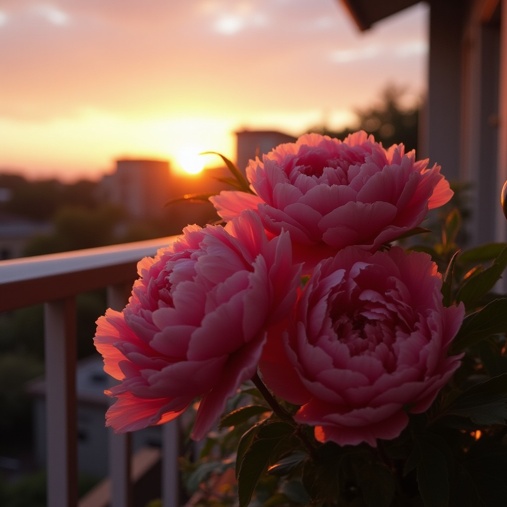 Three vibrant pink peonies bloom gracefully on a balcony while the sun sets, casting a warm glow over the scene and city skyline.