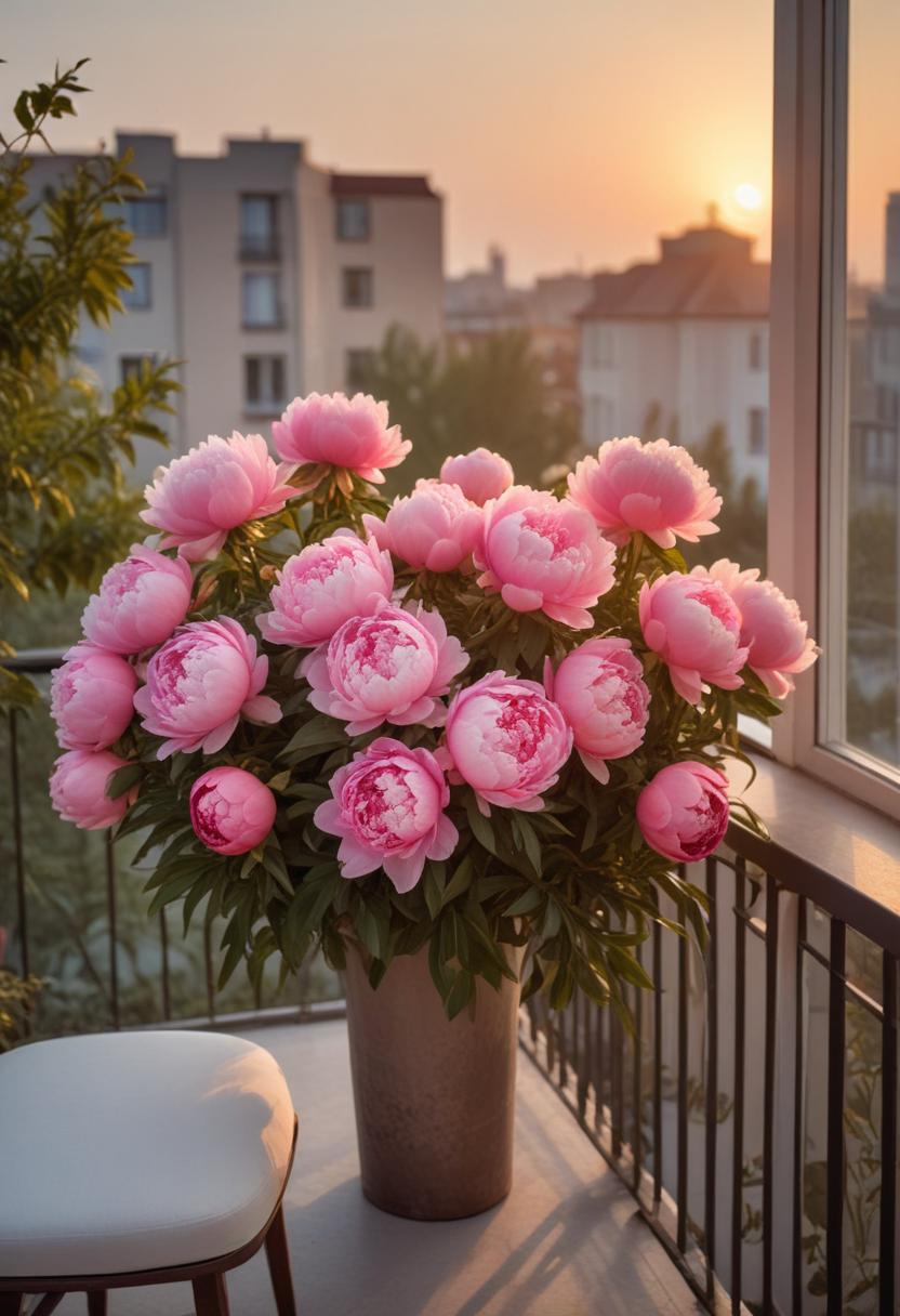 A bouquet of vibrant pink peonies fills a vase on a balcony, capturing the soft glow of sunset against a serene urban backdrop.