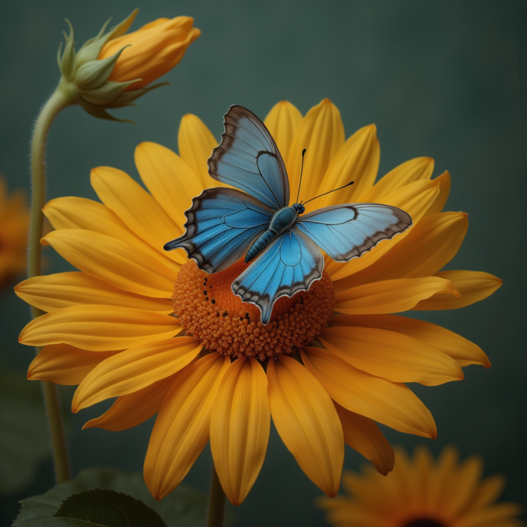 beauty, bloom, blue wings, butterfly, close-up, colorful, flora, garden, harmony, insect, macro, nature, peaceful, petals, pollinator, summer, sunlight, tranquility, wildlife, yellow flower