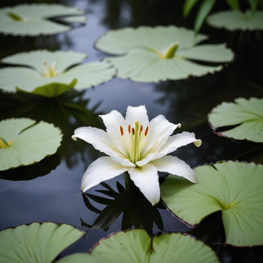 A stunning white lily gracefully floats atop calm water, surrounded by vibrant green leaves in a serene setting.