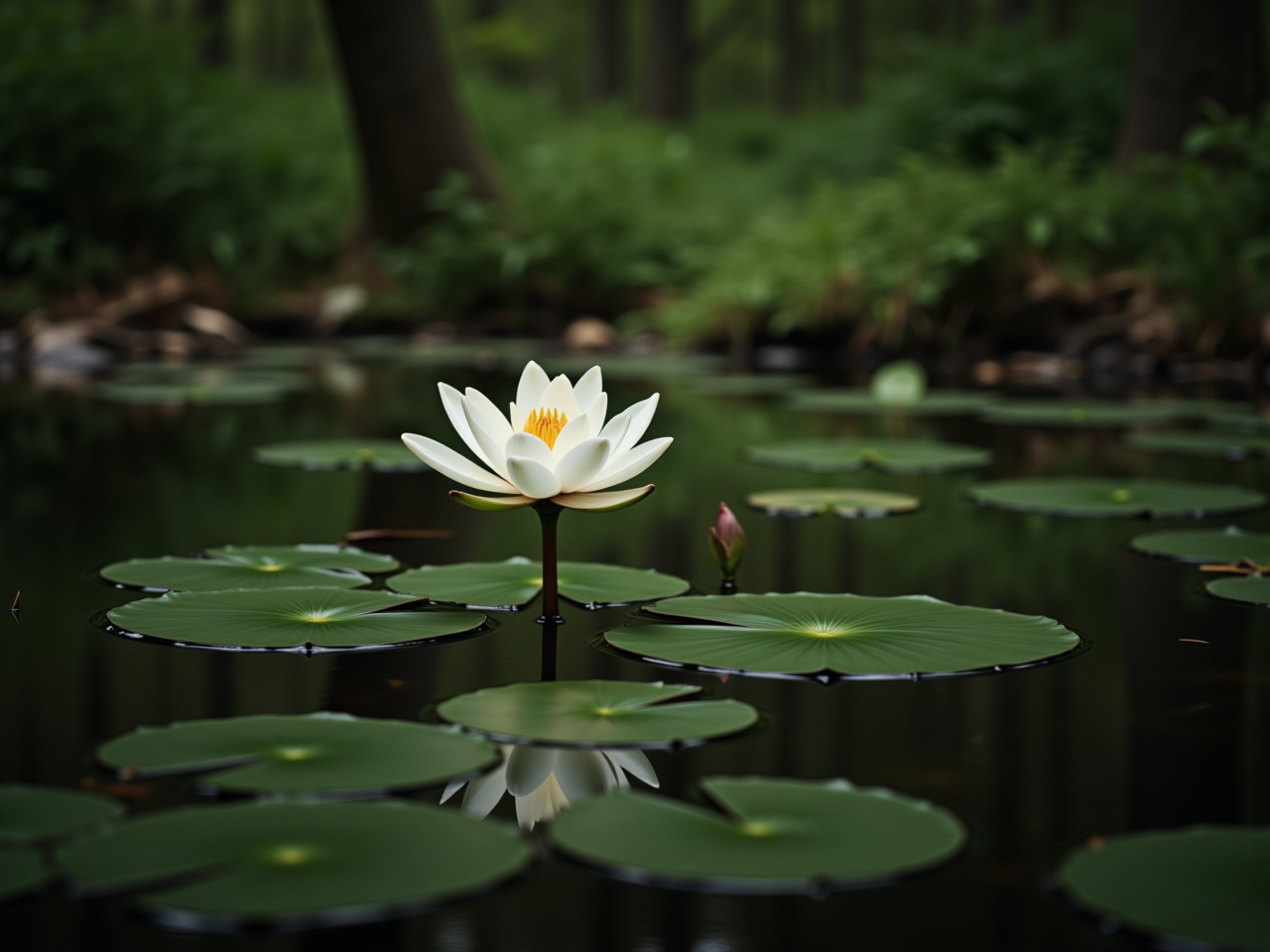A white water lily with yellow center floats gracefully on dark waters, surrounded by lush green leaves in a peaceful forest setting.
