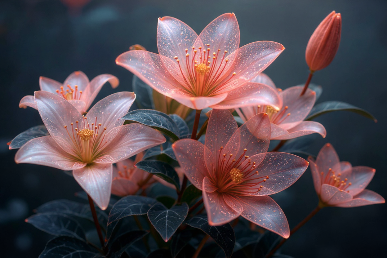 Delicate pink lilies display their beauty, showcasing vibrant petals and rich green leaves under gentle lighting.