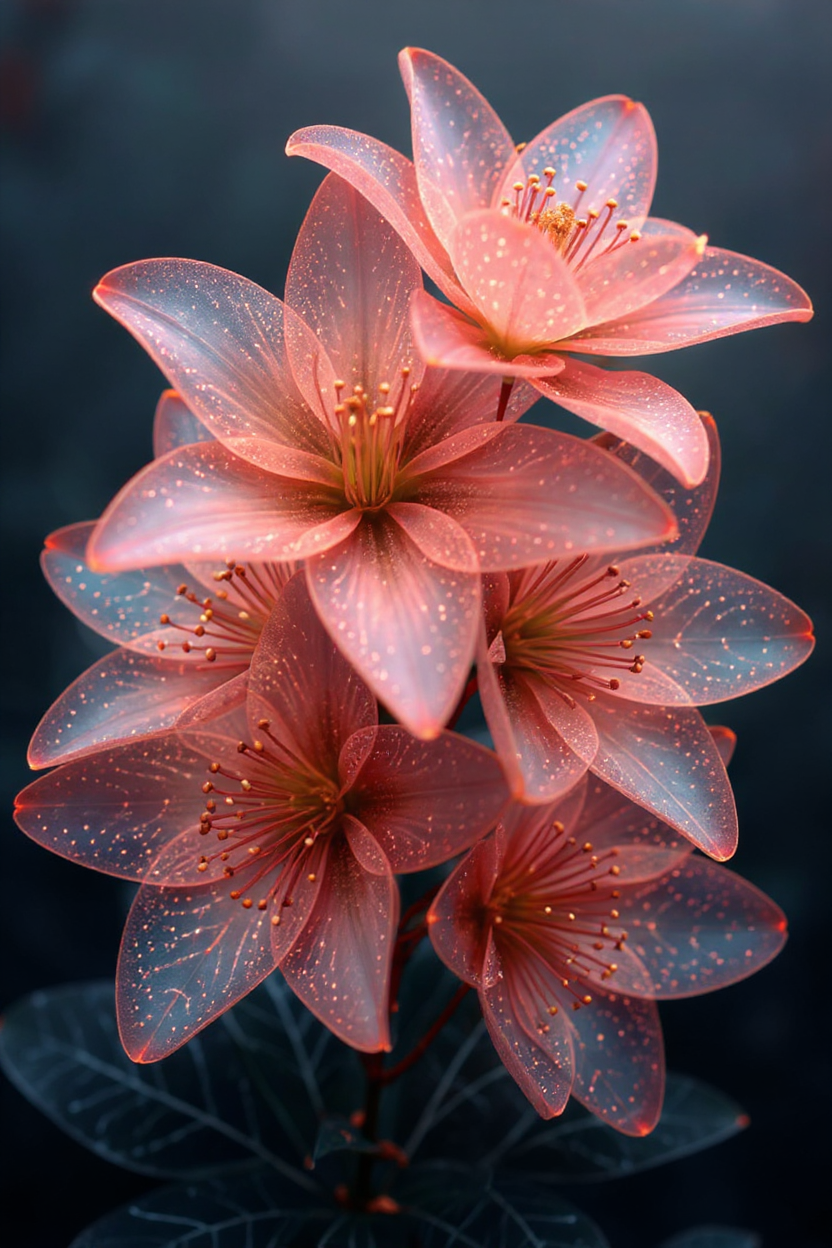 A cluster of translucent flowers displays captivating design, with soft petals and intricate patterns against a dark background.