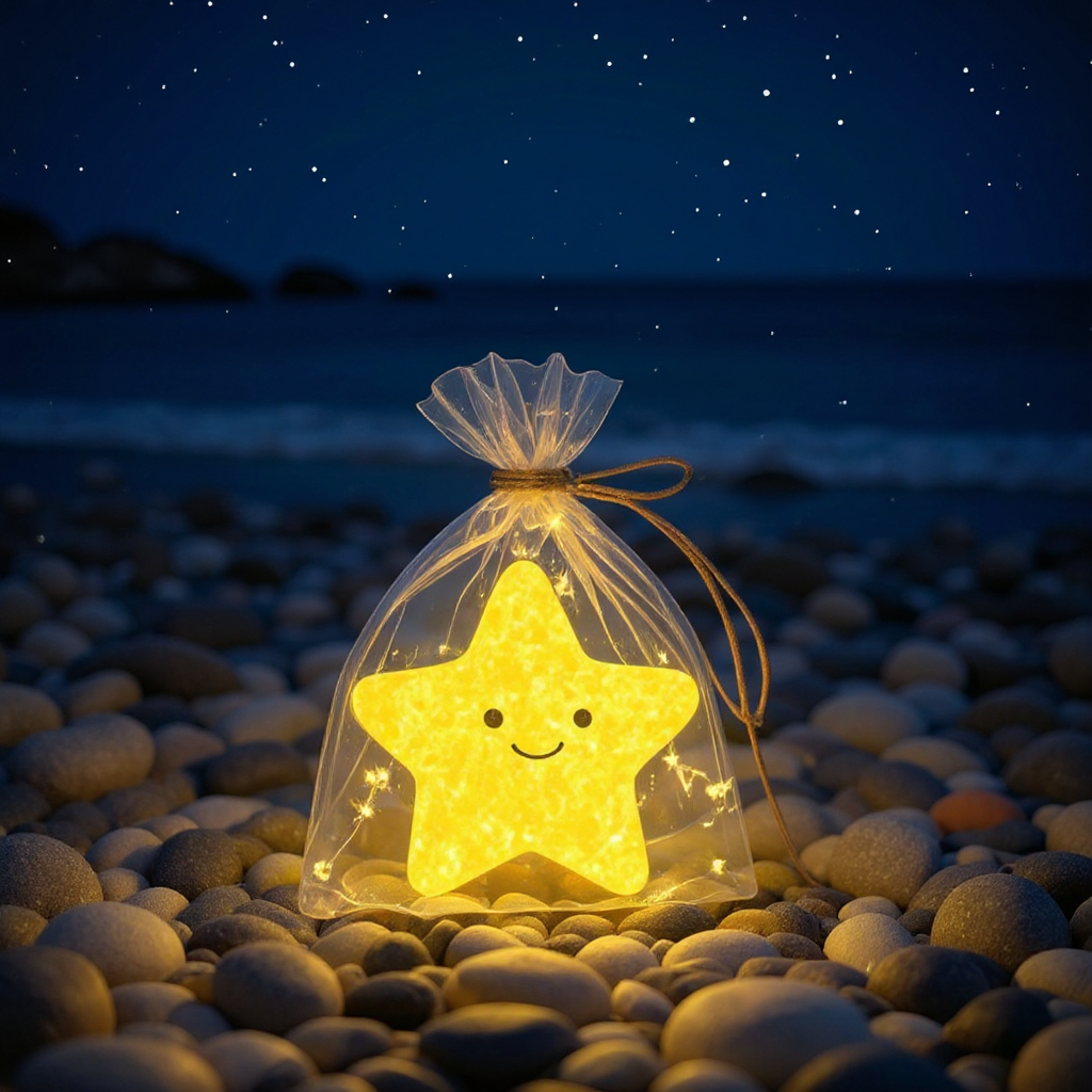 A glowing star-shaped light sits in a bag on smooth pebbles near the ocean at night, creating a serene and enchanting atmosphere.