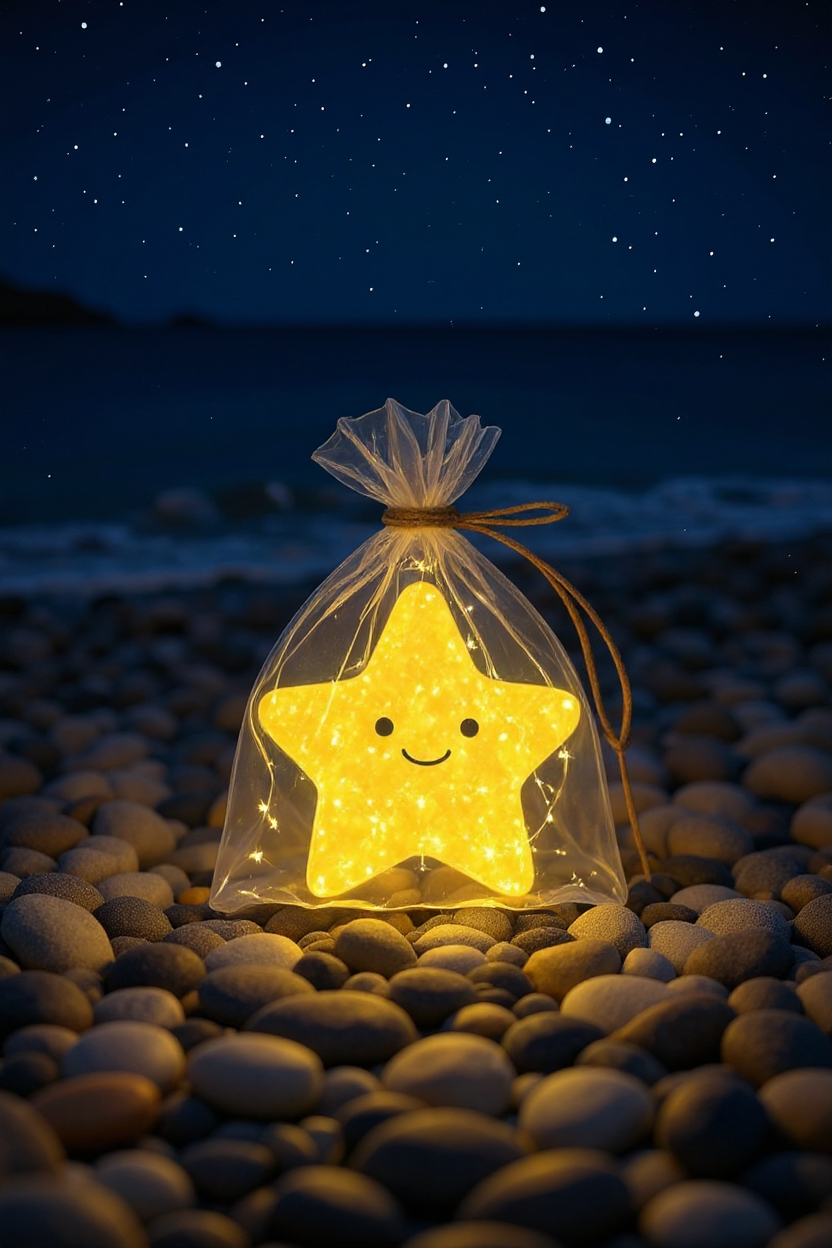 A glowing star decoration sits on smooth pebbles by the beach, illuminating the evening with warm light under a starry sky.