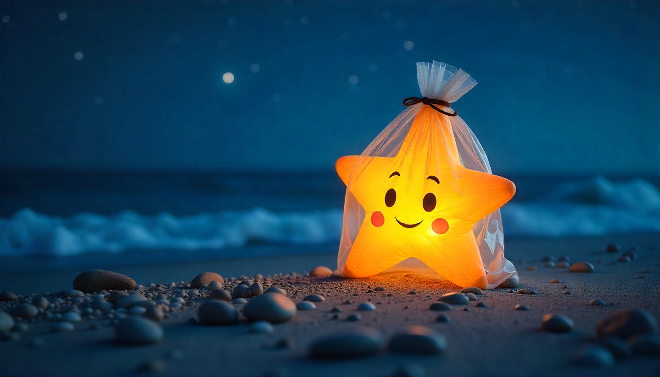 A glowing star lantern with a smiling face sits on the sandy beach at night, surrounded by small rocks and the ocean in the background.