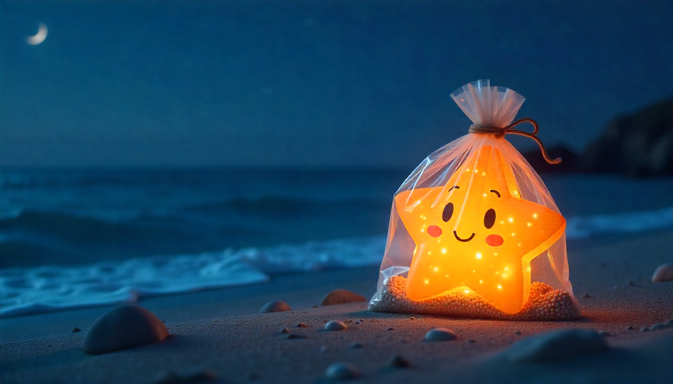 A glowing star-shaped lantern rests on the sandy beach, casting a warm light against the dark ocean waves and night sky.