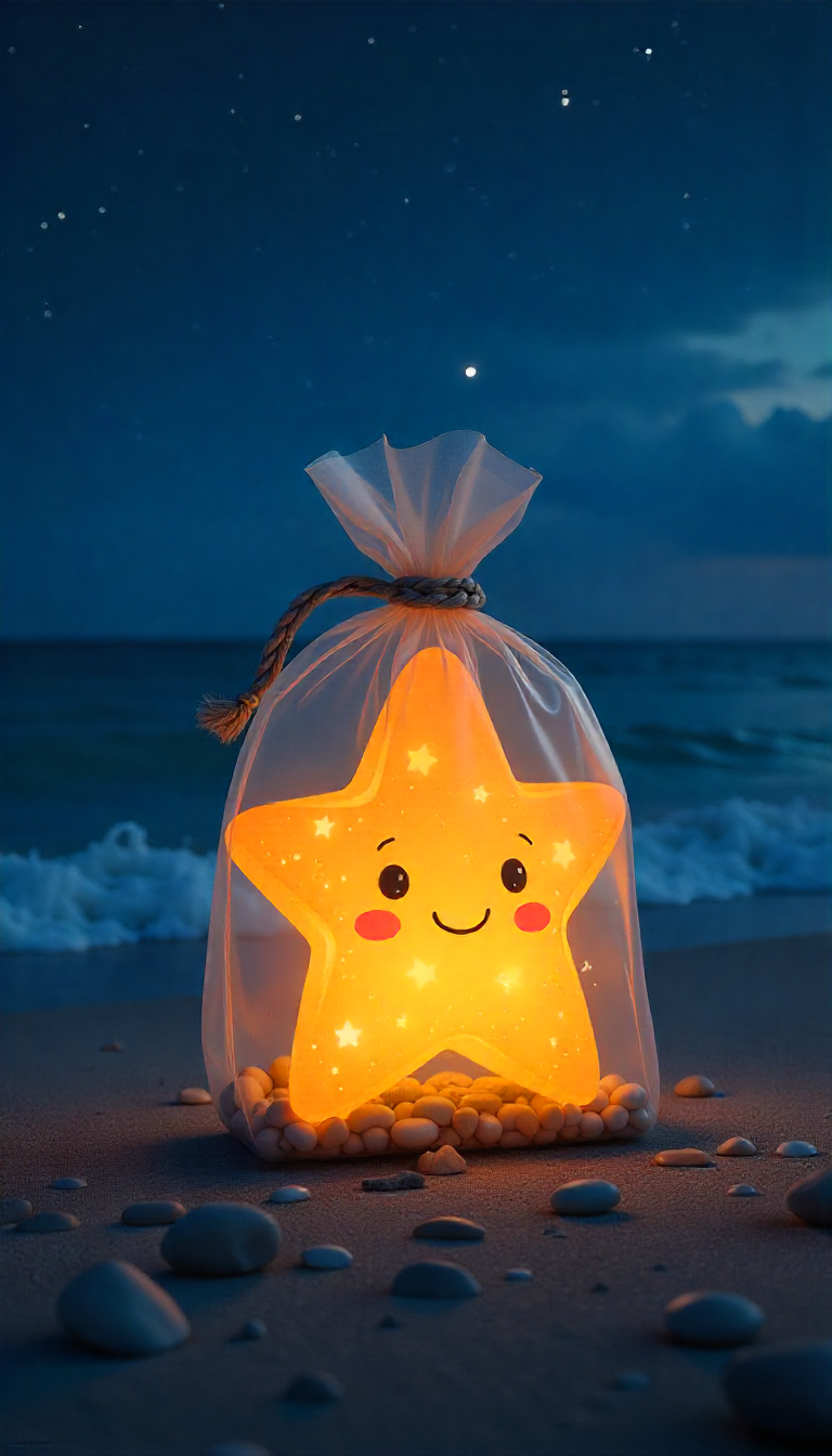 A glowing star lantern sits on a sandy beach, illuminated against the twilight sky, creating a whimsical atmosphere near the ocean.