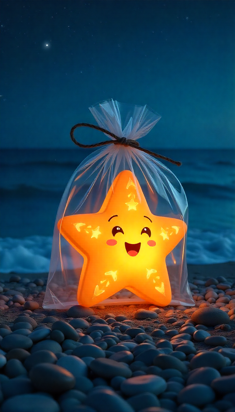 A cheerful star-shaped lantern glows softly on pebbles by the shore under a deep blue night sky, creating a whimsical atmosphere.