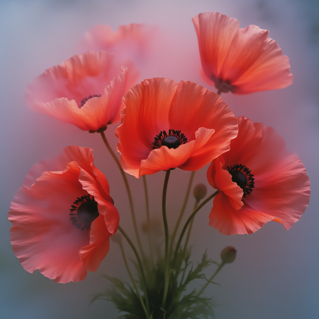 A bouquet of red poppies stands gracefully, showcasing delicate petals and dark centers, illuminated by gentle, ambient light.