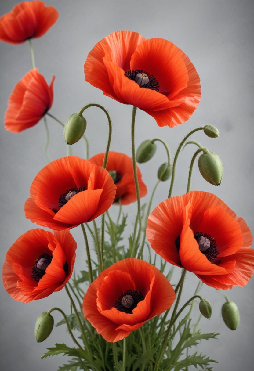A vibrant arrangement of red poppies showcases their delicate petals and green buds against a soft gray background, creating a striking visual.
