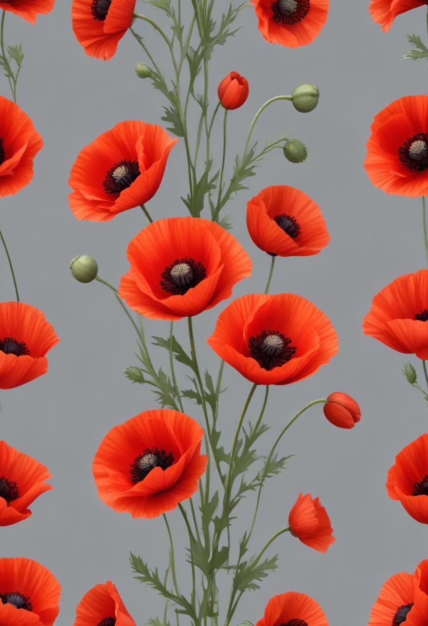 Bright red poppies with black centers bloom on green stems, creating a striking floral pattern on a soft gray backdrop in spring.