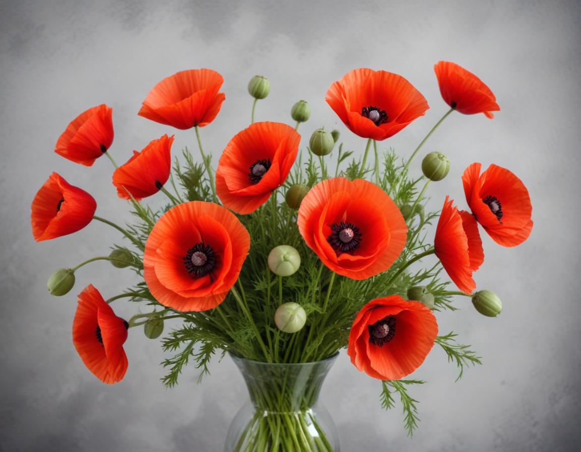 Vibrant red poppy flowers bloom elegantly in a clear vase, surrounded by green buds, creating a striking centerpiece for any setting.