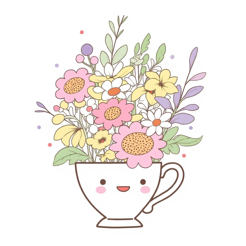 aesthetic, arrangement, art, botanical, cheerful, colorful, creativity, cup, cute, decoration, design, floral, flowers, happy, illustration, joyful, nature, pastel, smiling, spring