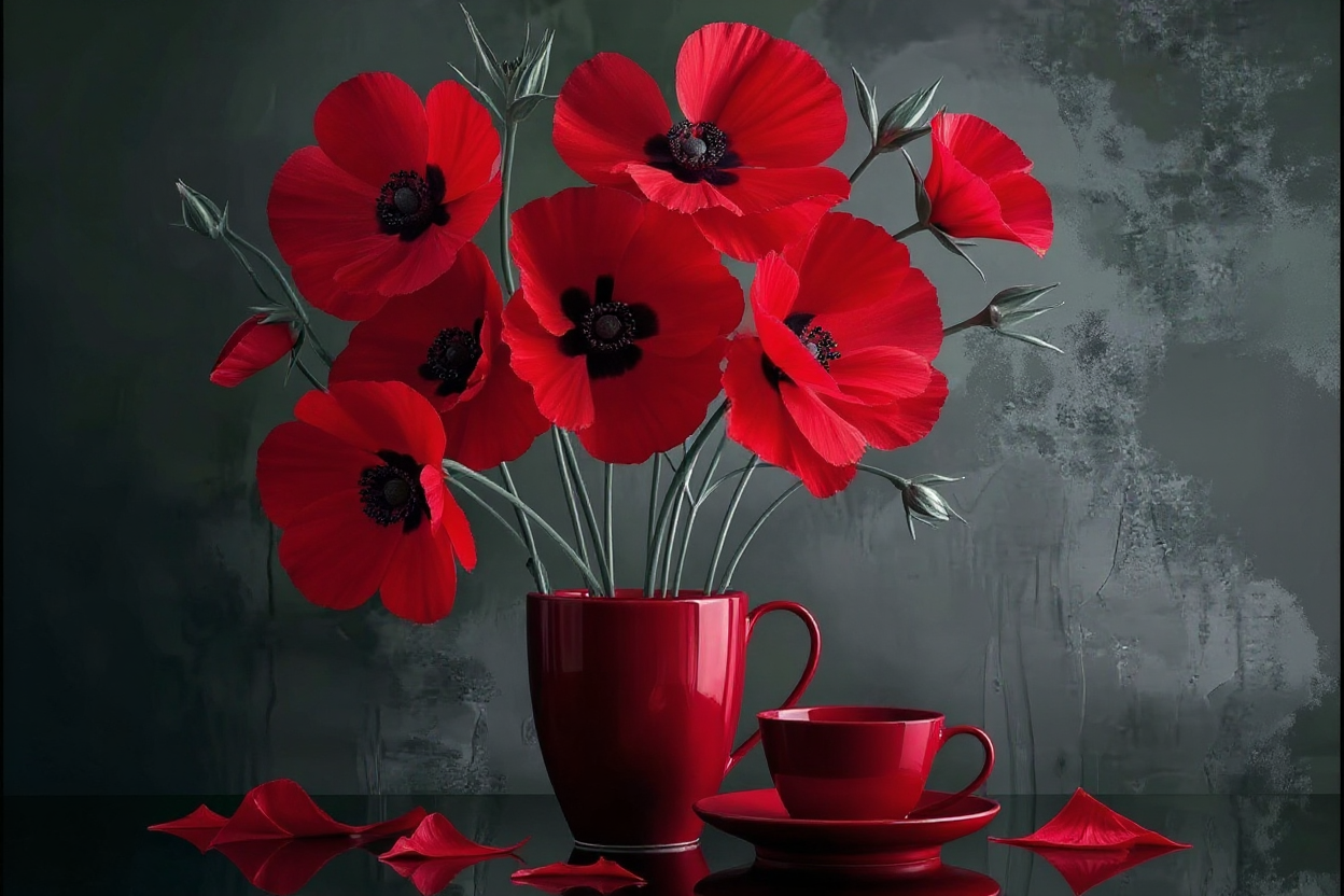 A striking display of vibrant red paper poppies in a red vase, accompanied by matching teacups, set against a dark background.