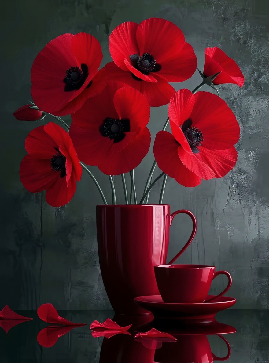 Bold red poppies arranged in a sleek red vase create a striking contrast against a dark background. Petals and a cup add elegance.