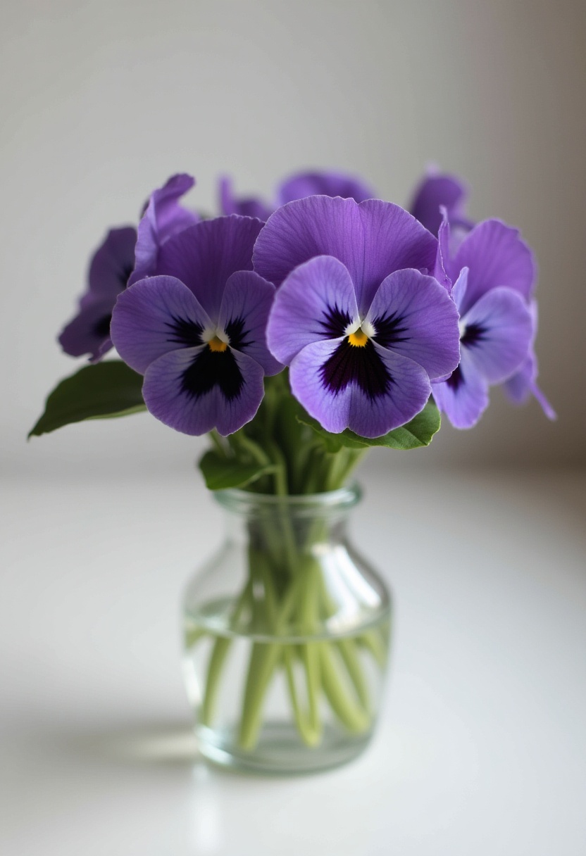 A bouquet of stunning purple pansies with dark centers arranged in a simple glass vase, brightening the room with their color.
