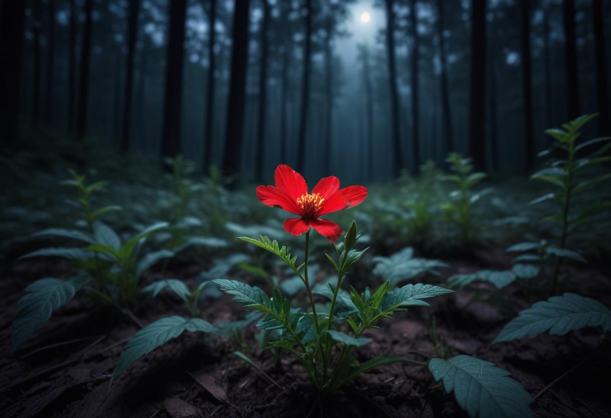 Red flower blooms in a misty forest at dawn