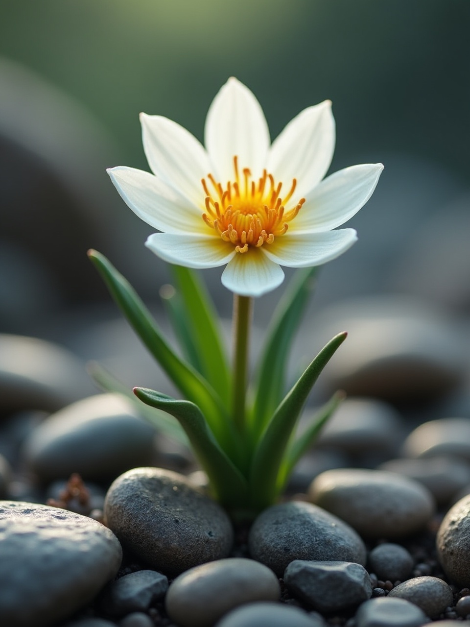 A striking white flower with yellow center grows from pebbles, showcasing nature’s beauty and resilience in a serene environment.