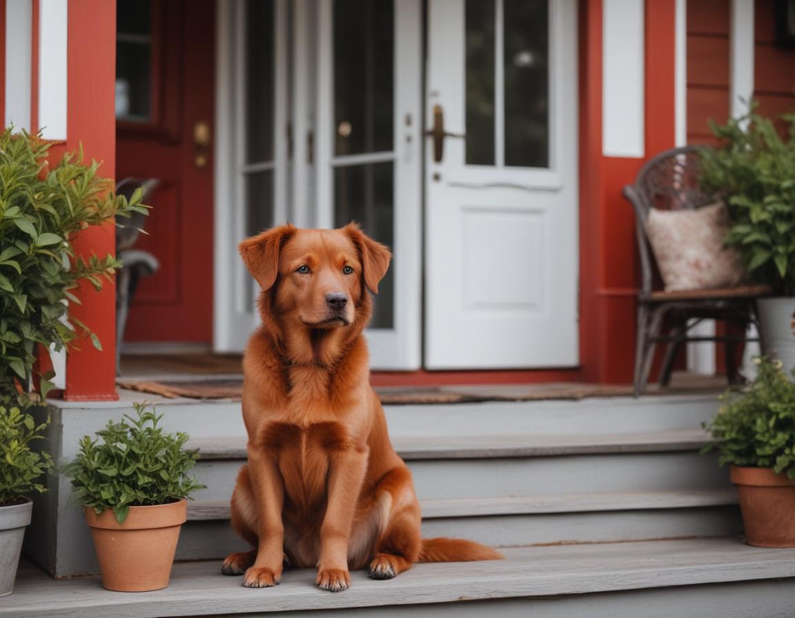 Dog sitting on porch of a red house with potted plants