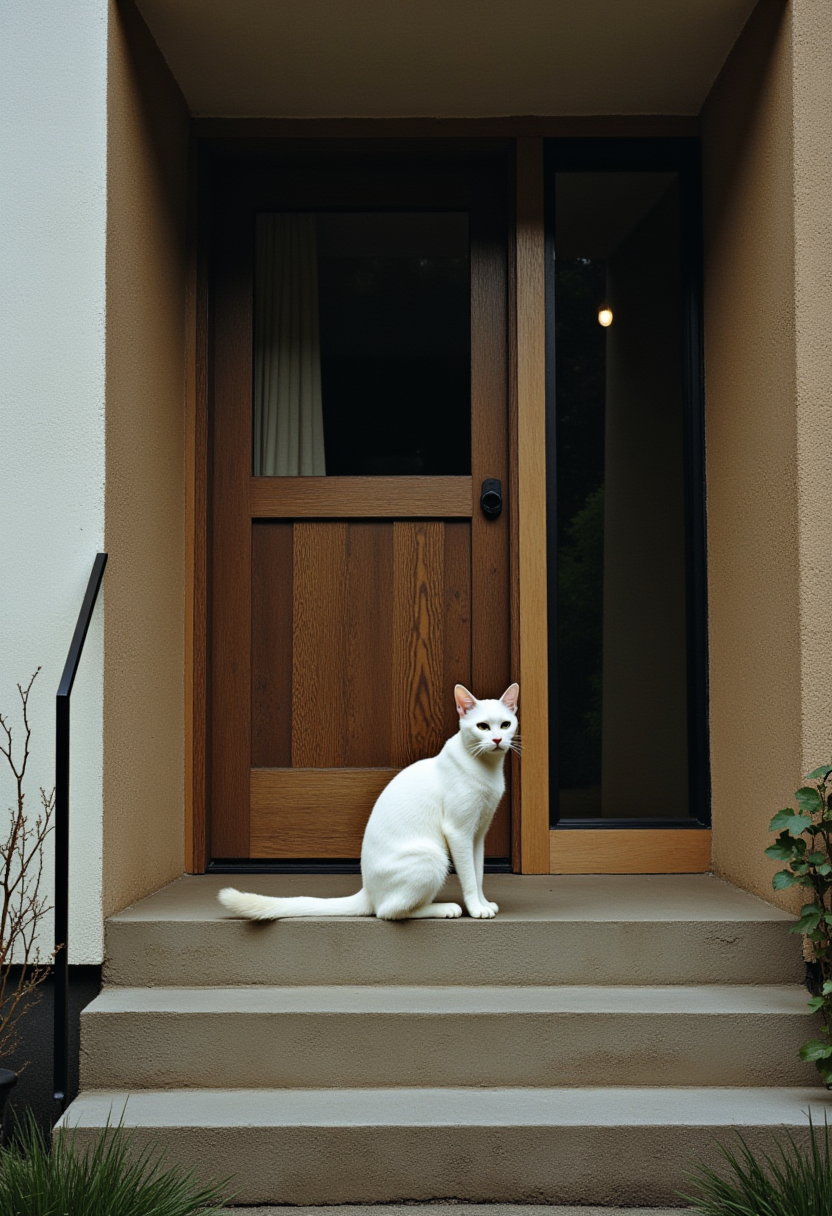 A white cat rests on the steps of a stylish home, gazing calmly at the entrance near greenery, blending with the contemporary architecture.