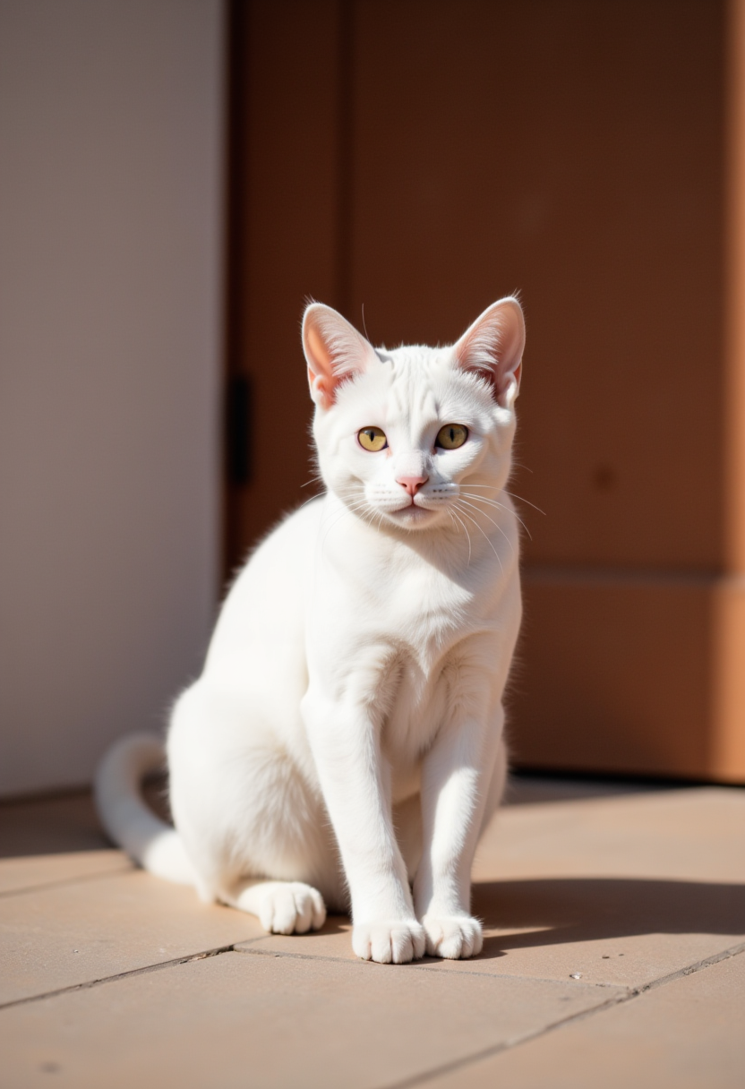 White cat sitting calmly in sunlit room