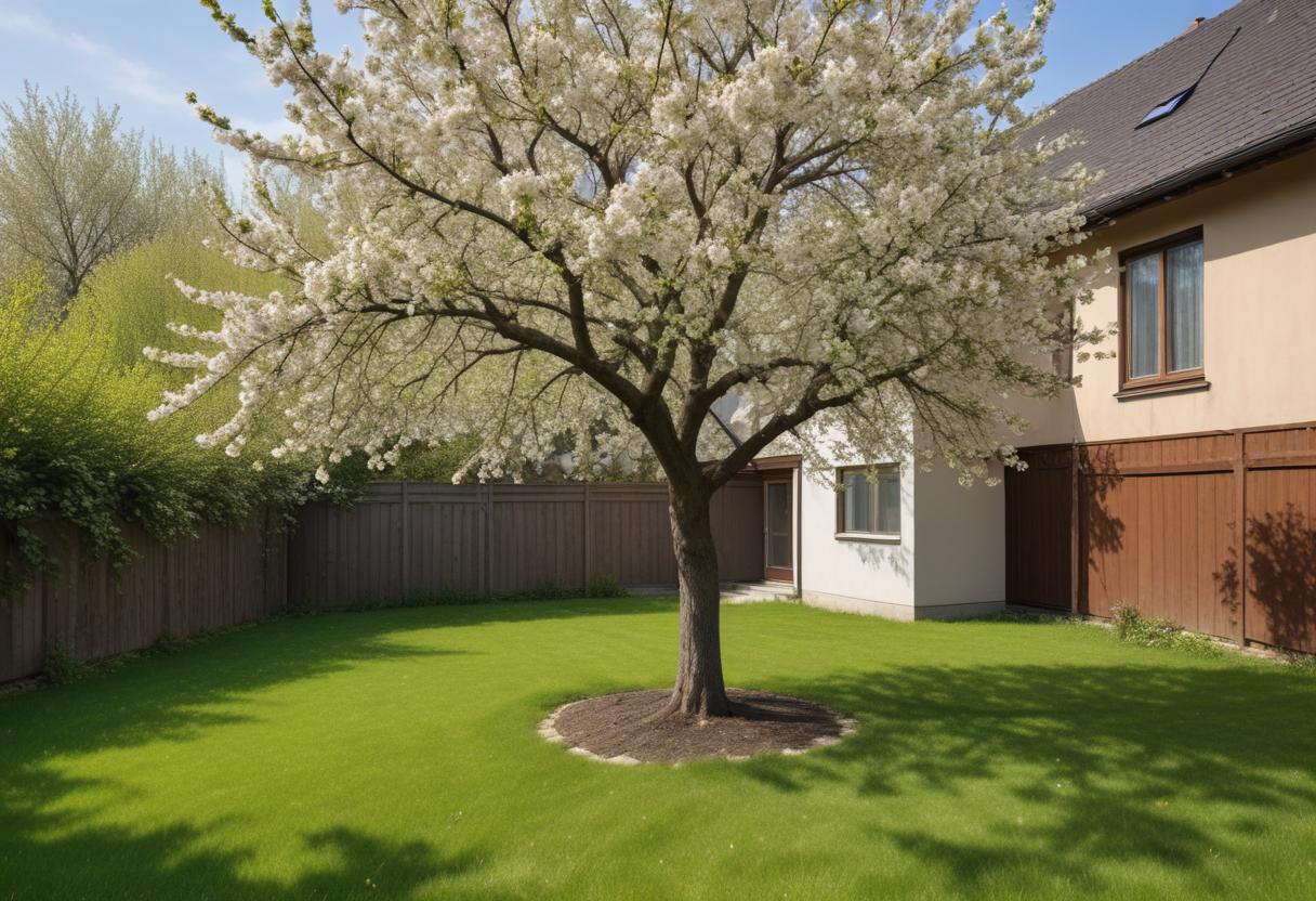 backyard, bloom, blossoming tree, fresh air, garden, green grass, horticulture, landscaping, lawn care, nature, outdoor space, relaxing environment, residential area, rural home, seasonal change, springtime, sunny day, tranquility, white flowers, wooden fence