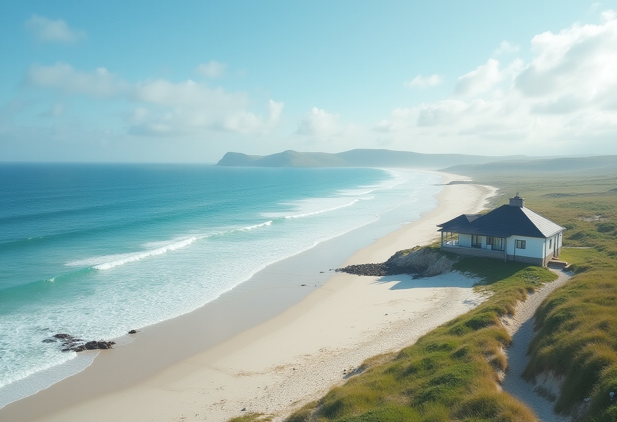 Coastal view with a house beside the beach at sunset