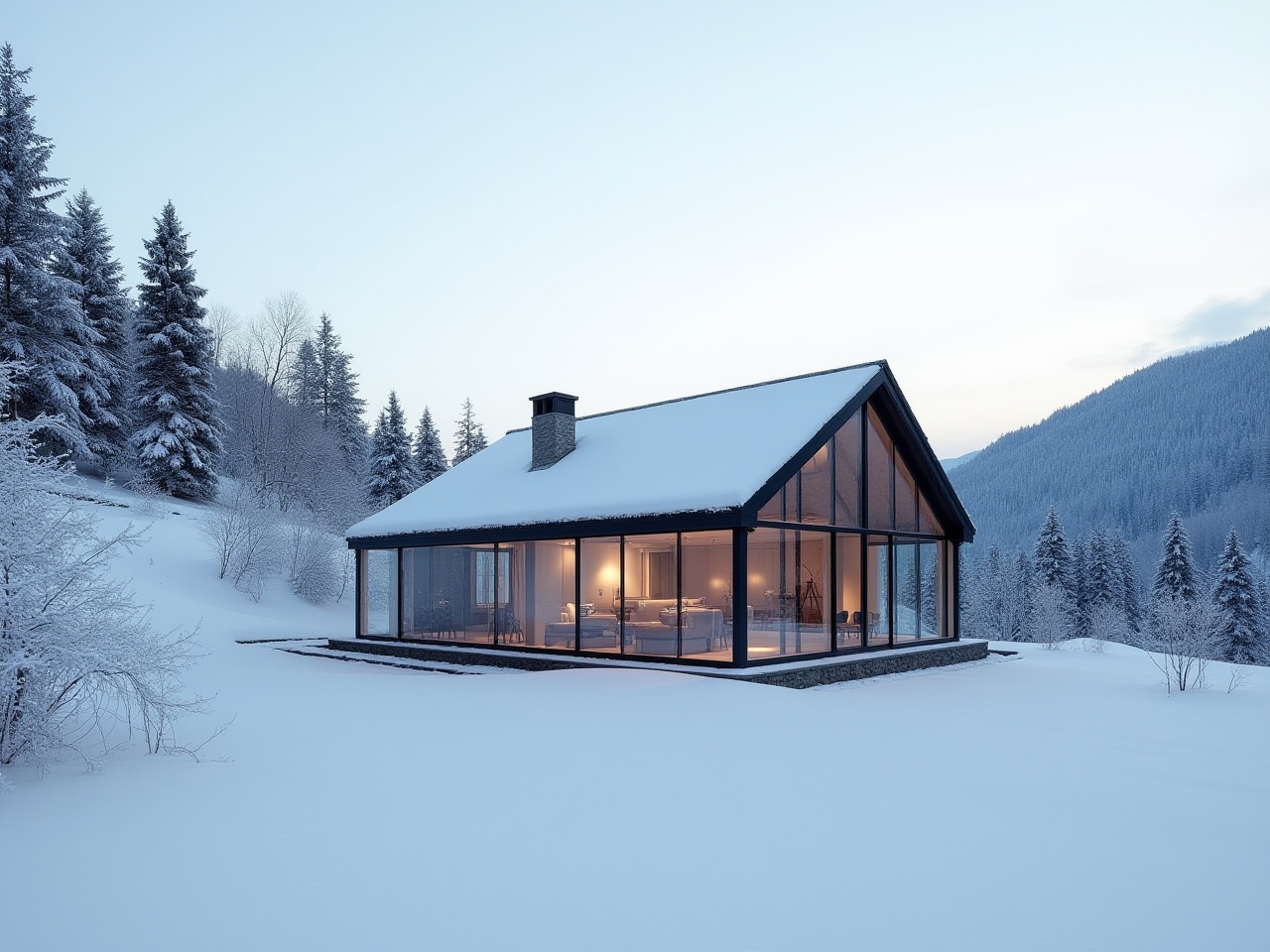 A sleek cabin with large glass walls stands in a winter wonderland. Snow blankets the ground, and the surrounding trees are frosted.