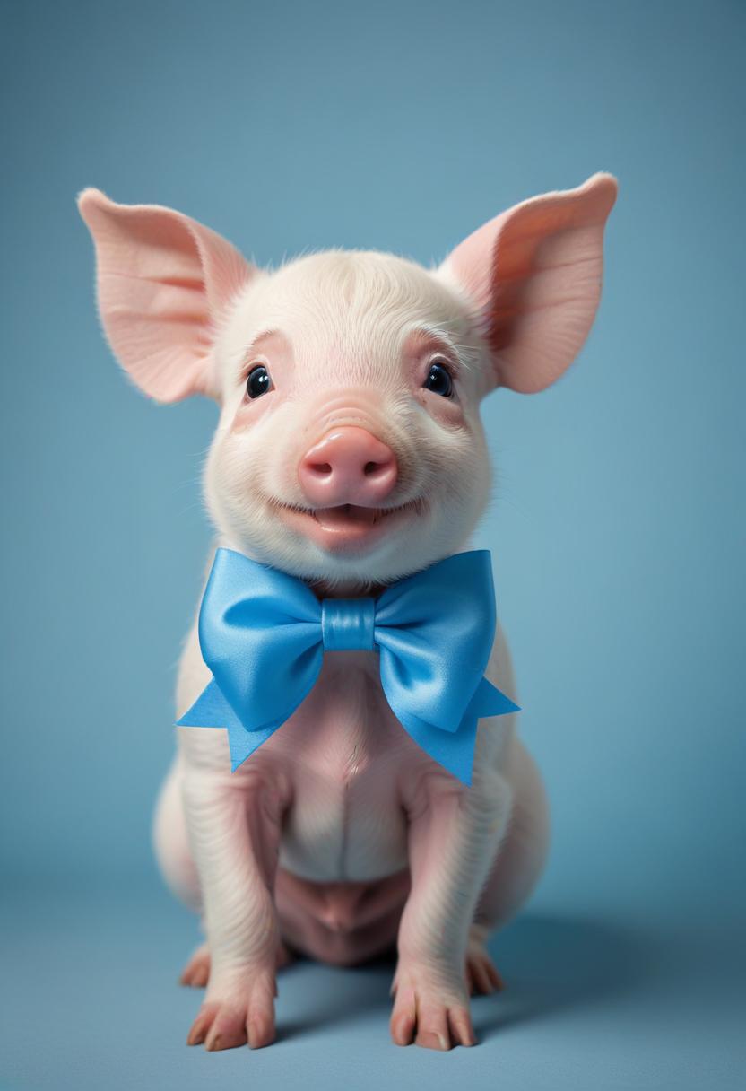 A cheerful piglet sits upright with a blue bow tie, posing against a solid blue background, exuding cuteness and charm.