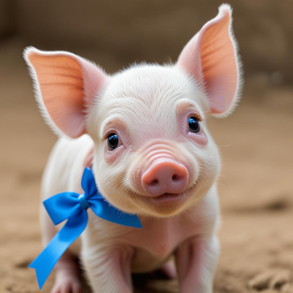 A cheerful piglet with bright eyes and a blue bow explores its warm enclosure, showcasing its playful and friendly nature.
