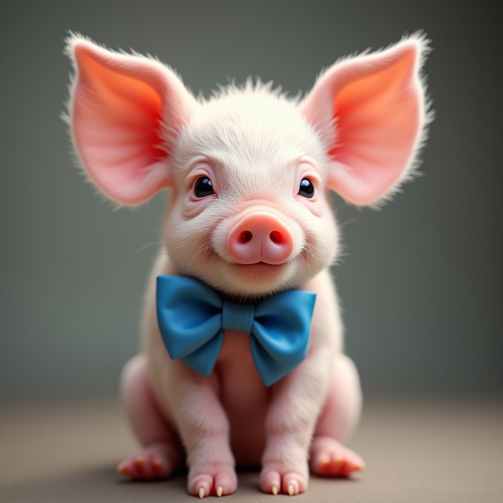 A small piglet with fluffy ears and a blue bowtie sits happily on a neutral background, displaying a joyful expression.