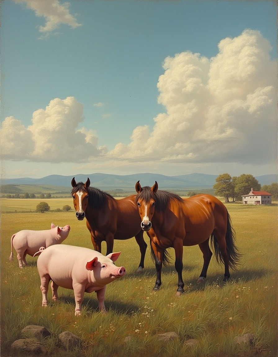 animals, blue sky, clouds, countryside, farm, field, grass, grazing, horizon, horses, landscape, lush, nature, outdoors, peaceful, pigs, rural, serene, sunny, wildlife