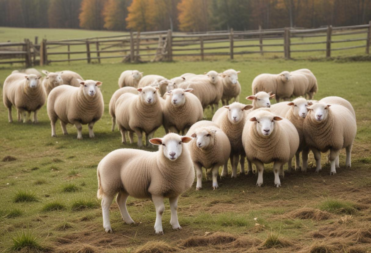A group of sheep gathers in a lush green field surrounded by wooden fences on a clear day, capturing the tranquility of farm life.