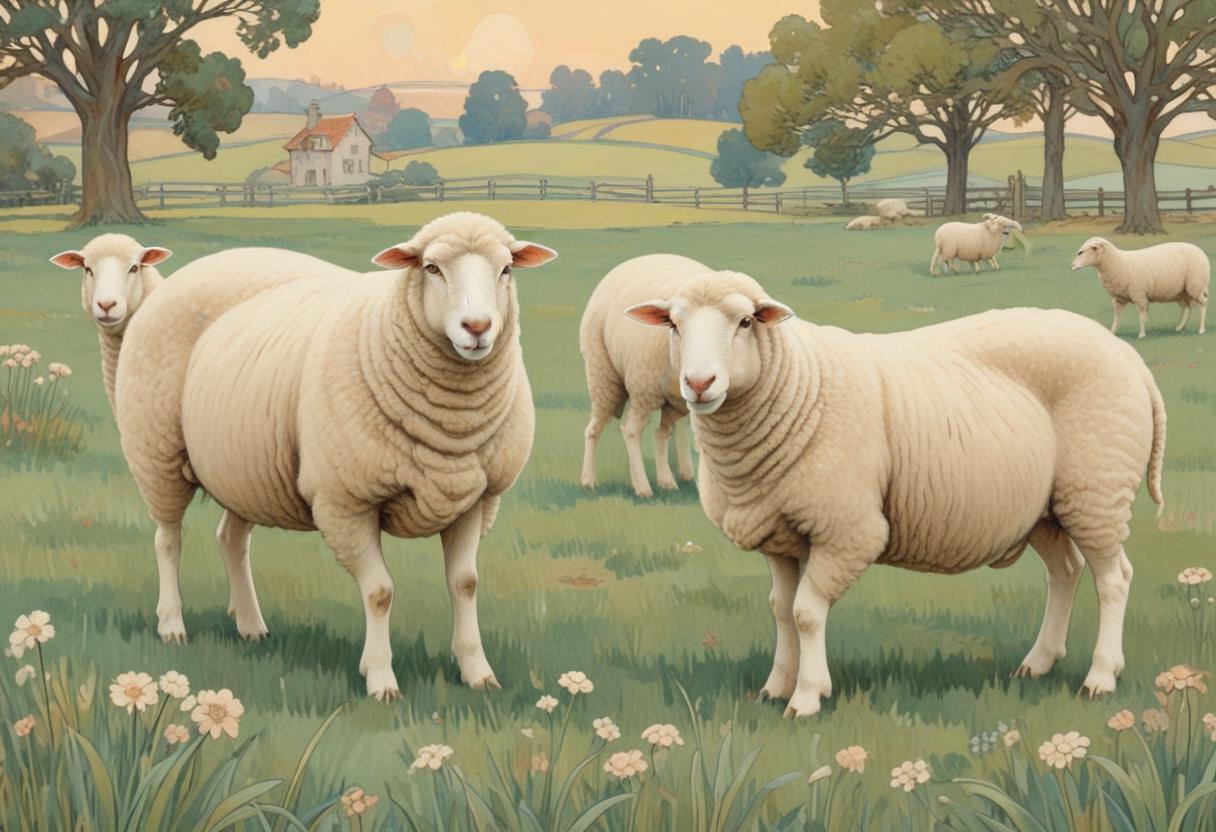 agriculture, animals, countryside, farmhouse, farming, fields, flowers, grazing, horizon, landscape, livestock, nature, pasture, rural, serene, sheep, sunset, tranquil, trees, wool