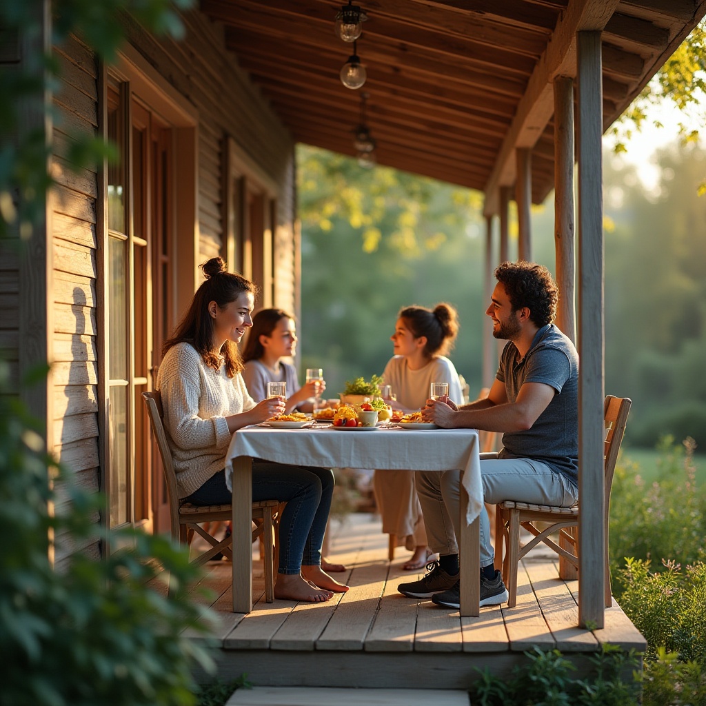Friends enjoy a meal together on a porch during sunset, surrounded by nature and warm light. Laughter and conversation fill the air.