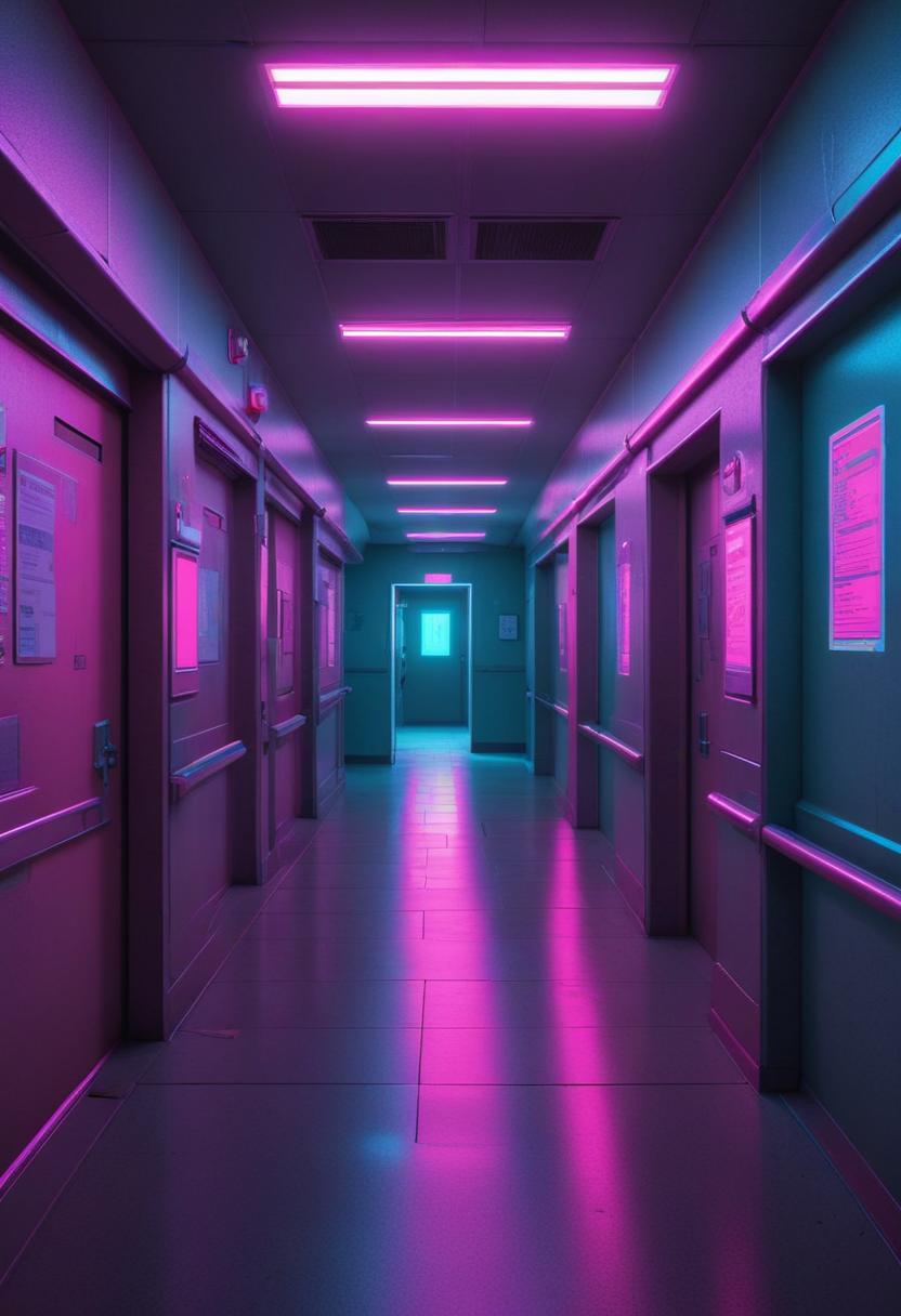 A vibrant hallway glows with pink and blue neon lights, creating a futuristic atmosphere. The corridor extends into a distant doorway.