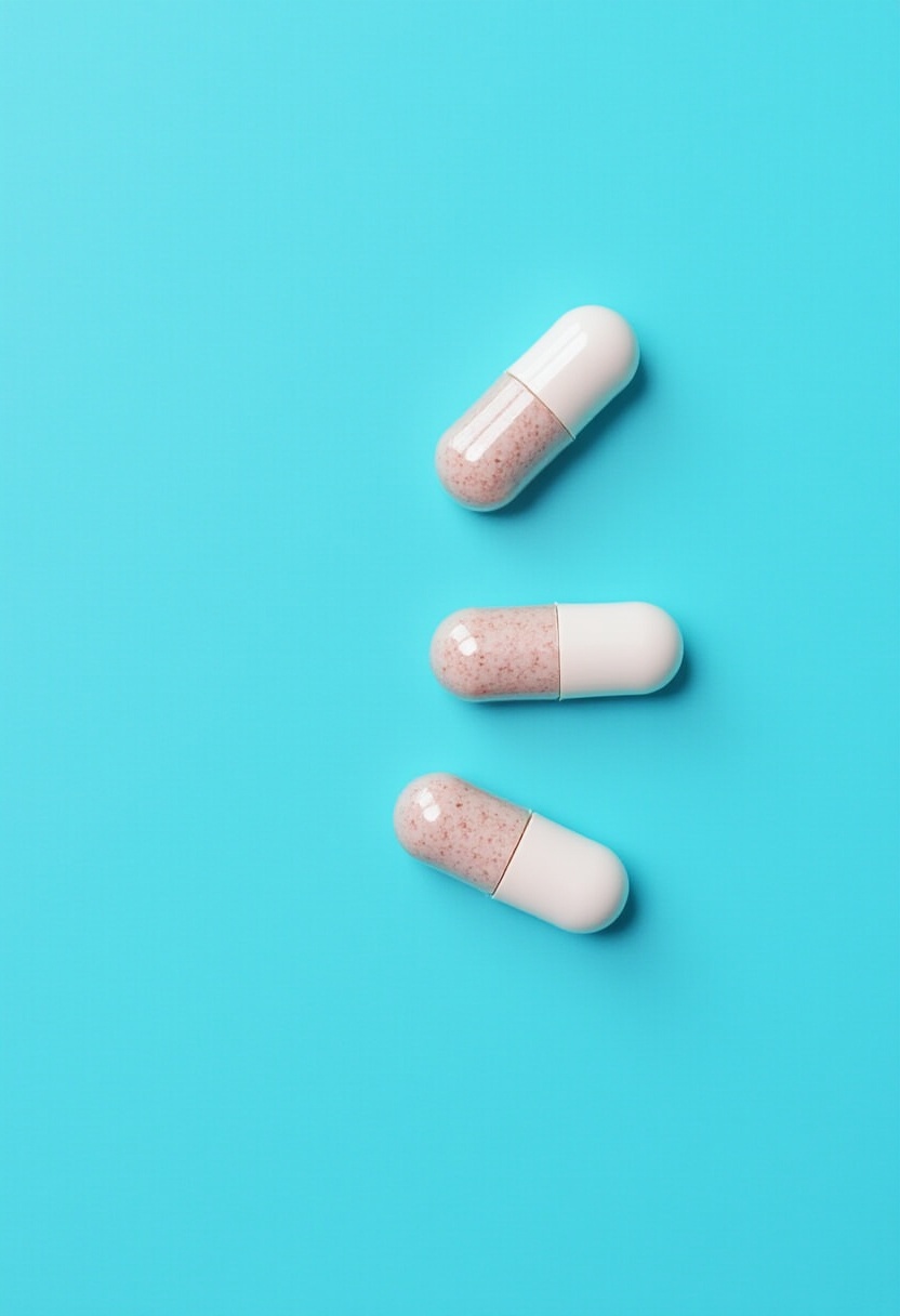 Three white capsules filled with light brown powder rest on a vibrant, solid blue surface. The pills are arranged in a vertical row.