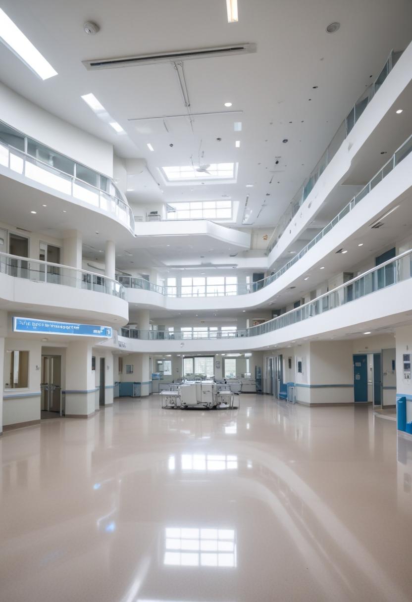 Bright and open hallway in a modern hospital featuring multiple floors and clean surfaces. Natural light streams through large windows.
