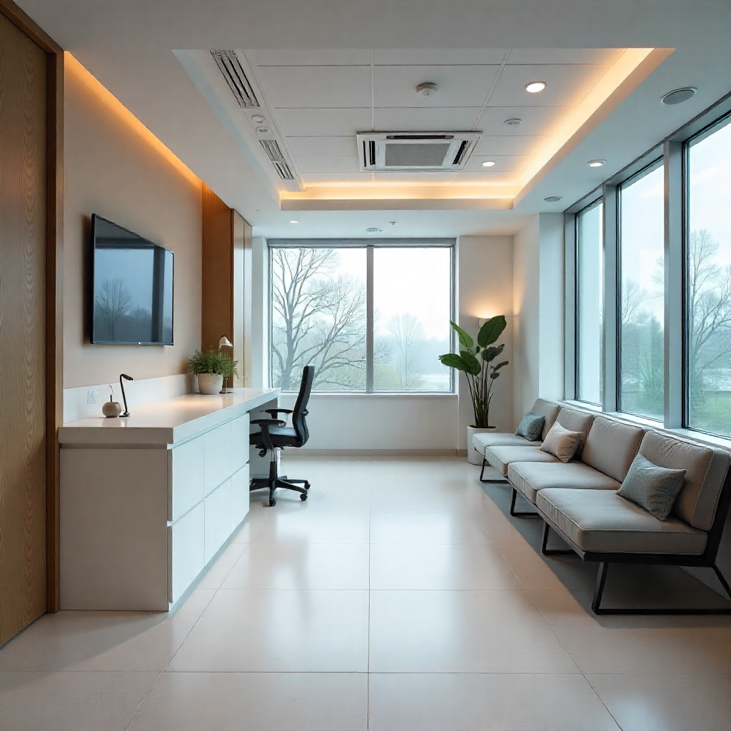 Modern office interior with large windows and seating area