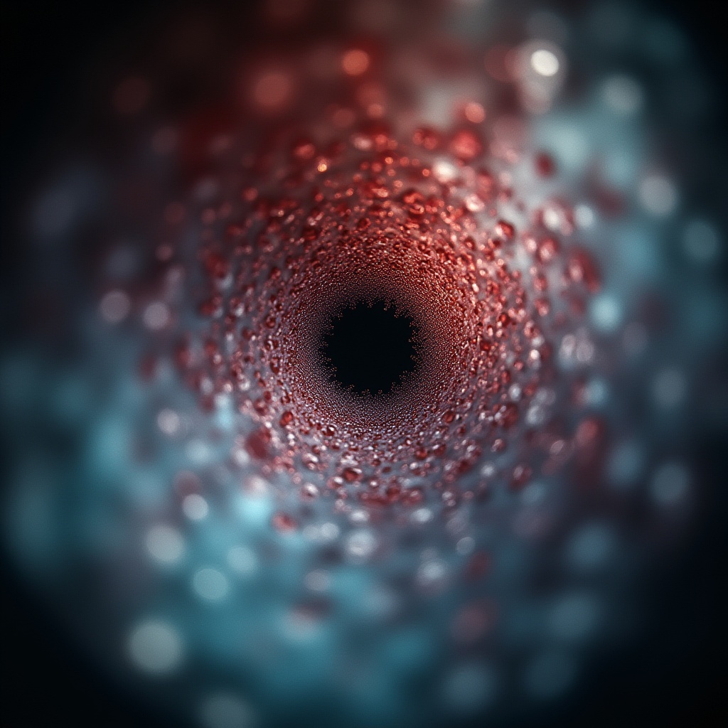 A swirling tunnel showcases a mesmerizing blend of red and blue particles, creating a captivating visual effect.