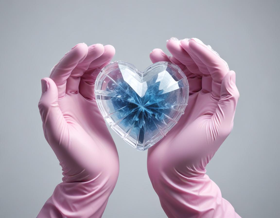 Two hands in pink gloves gently hold a transparent heart containing a blue crystal inside, showcasing a delicate and artistic display.