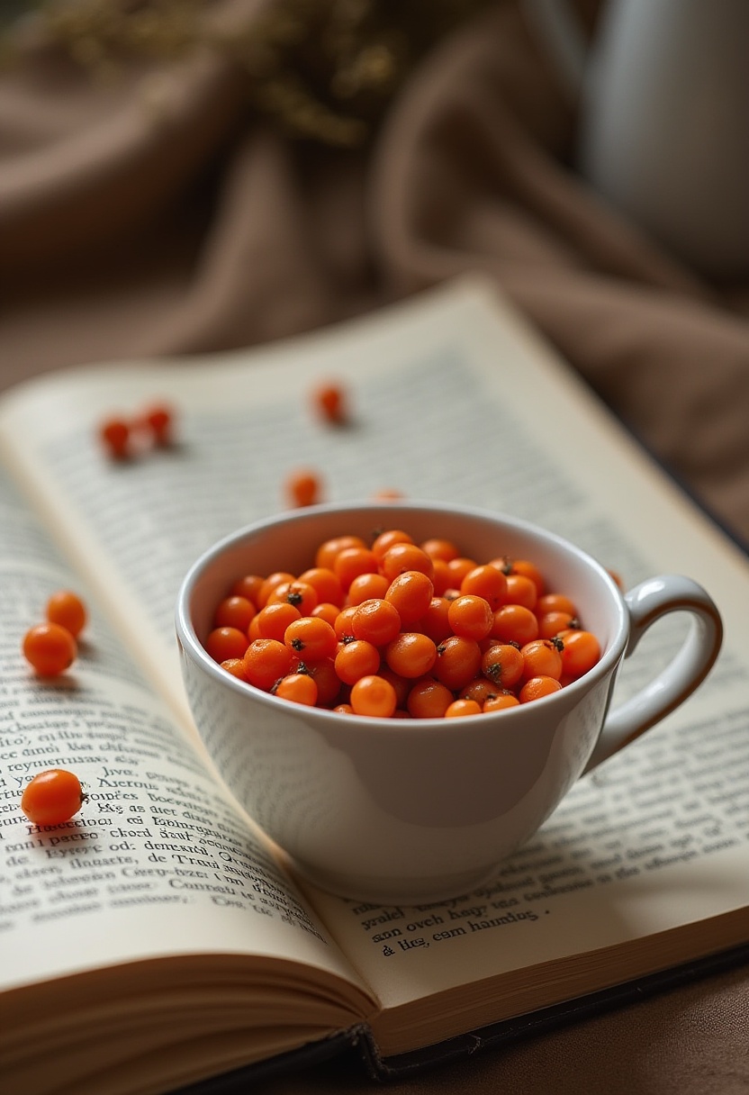 A white cup filled with bright orange sea buckthorn berries rests atop an open book, creating a cozy and inviting atmosphere.